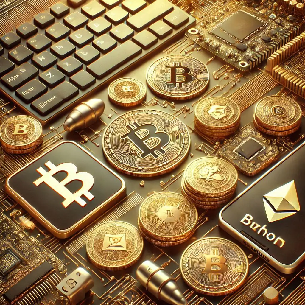 Bitcoin, Solana, Ethereum, Dogecoin, Shiba Inu in a tech view with a golden theme